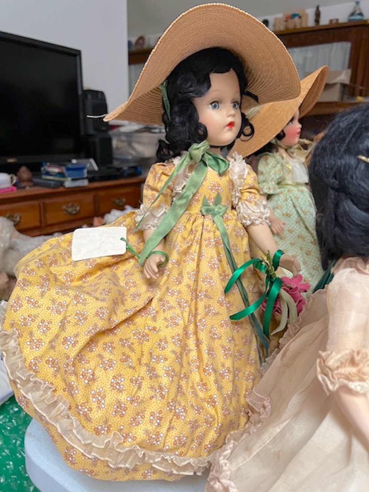 Member Jenell Howell did a program on Margaret Mitchell, author of Gone with the Wind, and the Madame Alexander dolls inspired by her book. She gave the club a brief biography of Mitchell, who was born into a wealthy family on November 8, 1900.  Her father was a lawyer and her mother was a suffragist. There were a number of Confederate veterans in her family, so she heard lots of stories about the Civil War. When she was six years old, her mother took her on a tour of burned plantations.  Mitchell stated that she was 12 years old when she discovered that the Confederacy did not win the Civil War.  At 22,  Mitchell became a journalist. She injured her ankle at the age of 26 and her husband encouraged her to write a novel while she was recuperating.  Ten years later in 1936, Gone with the Wind was published.  The novel was an immediate success and won the Pulitzer Prize for fiction.  The novel resonated with those who were prosperous in the 1920s and suffering in the Great Depression.  In 1939, the Gone with the Wind movie was released.  Mitchell was struck by a car on August 11, 1949, as she was walking to the movies with her husband and passed away five days later due to her injuries.