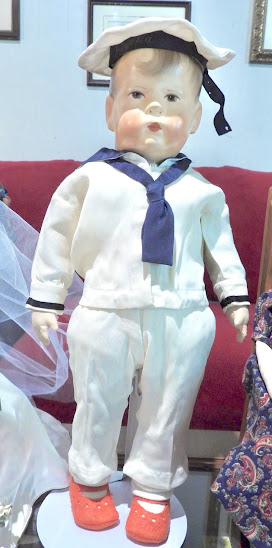 Sylvia McDonald shared this handsome lad, made by German doll artist Käthe Kruse. He was the childhood doll of her great-aunt, who was born in 1902. Sylvia thinks her aunt received the doll around 1912. He still has his original box and a wardrobe of clothes, including this spiffy sailor suit.
